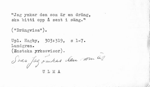 //// flJag ynkar den som är en dräng, //// ska bitti opp å sent i säng.11 j //// i [ //// S //// i //// (ft Drängvis a"). //// <J //// Upl. Hagby, 303:319, b 1-7. Lundgren. //// (Enstaka yrkesvisor). //// cf*«4>, /oj ^u^A^i ^ //// niii //// . // ////