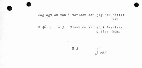 //// Jag ägt en vän i världen den jag har hållit //// kär //// B 4651, s 3 Visan om vännen i Amerika. //// 6 str. kom. //// v. //// R A //// c) ////
