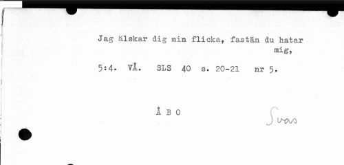 //// Jag älskar dig min flicka, fastän du hatar //// ¦ //// mig, //// 5:4. TA. SLS 40 s. 20-21 nr 5. //// i //// 1 BO //// J VW ////