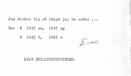 //// Jag älskar dig så länge jag än andas ... Se: E 1835 cc, 1837 gg //// i * //// i I //// I //// N 1843 f, 1855 C i //// KB:S SKILLINGTRYCKSREG. //// 1 ////