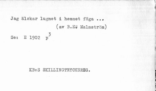 //// I //// Jag älskar lugnet i hemmet föga ... //// (av B.E® Malmström) //// Se: E 1902 p^ //// ¦ //// KB:S 3KILLINGTRYCKSHEG. | //// ¦ //// ¦ ¦ //// I ¦ //// I ////