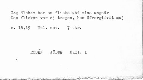 //// Jag älskat har en flicka uti mina ungaår Den flickan var ej trogen, hon öfvergifvit mej //// s. 18,19 Mel. not. 7 str. //// ROSEN J ÖDDE Haft. 1 ////