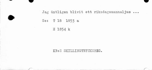 //// Jag äntligen blivit ett riksdagsraannaljus ... ^ Se: T 18 1853 a //// E 1854 k //// KB:S SKILLINGTRYCKSREG. ////