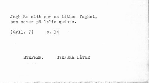 //// Jagh är alth som en lithen fughel, som seter på lelie quiste. //// (Gyll. 7) s. 14 //// i //// f //// STEFFEI. SVENSKA LÅTAR //// --- ---,---,---^---*---...---*---c... JfcåSL;___4 ////