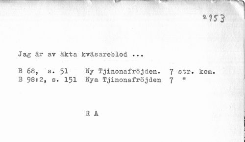 //// Jag är ar äkta kväsareblod .». //// B 68, s. 51 Hy Tjinonafröjden. 7 str. kom» B 98:2, s. 151 Tjinonafröjden 7 rt //// S Å ////
