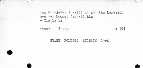//// Jag är bjuden i kväll ut att åka karusell men var kommer jag väl hän - Tra la la //// ? //// raggv. 4 str. s 305 //// SWAHN FOLKTRO ATJGERUM 1926 ////