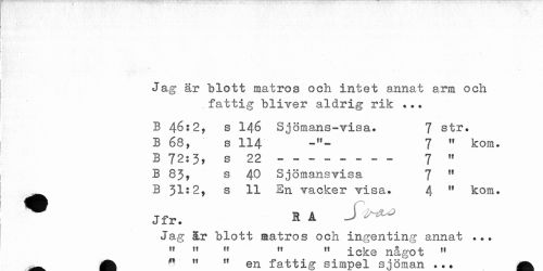 //// Jag är blott matros och intet annat arm och //// fattig bliver aldrig i t # //// B 46:2, s 146 Sjömans-visa» 7 str. //// B 68, s 114 -M- 7 tf kom. //// B 72:3, s 22 ---7 " //// B 83, s 40 Sjömansvisa 7 " //// B 31:2, s 11 En vacker visa. 4 11 kom. //// • Jfr. RA JW* //// Jag år blott matros och ingenting annat ... //// «» u tt n u icke ng,got n //// _ ^ * ,! 11 en fattig simpel sjöman ... A ////