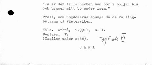//// ti SI SiT den lilla nacken som bor i ooljan ola och bygger mitt bo under isen.n //// Trall, som ungdomarna sjunga då de ro långbåtarna på Västerviken. //// Hals. Årbrå, 229921» s. 1. //// Dentzer, T. ^ ' //// (Trallar under rodd). ^^ \lPi ^ //// U L M A ////