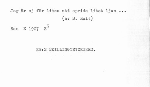 //// Jag är ej för liten att sprida litet ljus ... //// j //// (av S. Hult) | //// ? //// i //// Se: 1 1907 Z5 //// KB:S 3KILLINGTRY GK3REG. //// V ////
