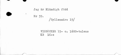 //// Jag är Eländigh född ^ Kr 39. //// /Gyllenmärs 19 / //// VISBÖCKEE 15- o. 1600-talens KB l6:o //// ___'_ ////