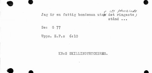 //// Jag är en fattig bondeman utaja" det ringaste^ //// stånd ••. //// Se: G 77 //// Upps* Z.P.s 6:10 //// KB:S SKILLINGTRYCKSREG. ////