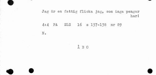 //// Jag är en fattig flicka jag, som inga pengar //// har! //// 4:4 PÄ SLS 16 s 157-138 nr 89 //// st. //// I B 0 ////