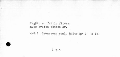 //// ¦ //// Jag^tär en fattig flicka, nyss fyllda femton år, //// 4:8.? Svenssons saml. häfte nr 2. s 1J. //// ÅBO ////