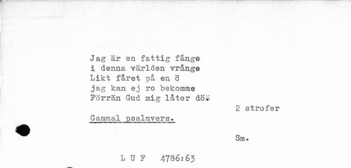 //// Jag är en fattig fånge i denna världen vrånge Likt fåret på en ö jag kan ej ro bekomme Förrän Gud mig låter dö® //// 2 strofer //// Gammal psalmvers. //// ^^ Sm. //// L U F 4786:63 ////