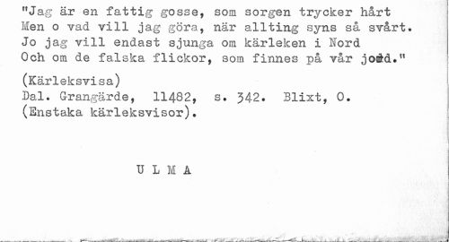 //// U cig; clX ÖII icib UXg gUööö, bUffl l/X^UJ&ÖX licLX 1/ //// Men o vad vill jag göra, när allting syns så svårt. //// Jo jag vill endast sjunga om kärleken i Nord //// Och om de falska flickor, som finnes på vår joåd." //// (Kärleksvisa) //// Dal. Grangärde, 11482, s. 342. Blixt, 0. (Enstaka kärleksvisor). //// ] //// Hli //// j //// ___*___ _ _ ...--¦¦ . . « ---»¦---v.-^/- '___t___Al<m<*. #v--- ¦ M-4.J-,---•---j.---JL .A ---j--- ////