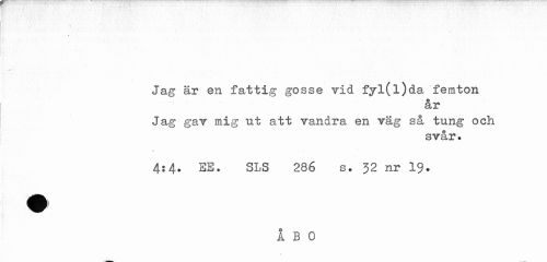 //// % //// Jag är en fattig gosse Tid fyl(l)da femton //// år //// Jag gar mig ut att vandra en väg så tung och //// svår. //// 4:4. SE. SLS 286 s. 32 nr 1?. //// • I //// f //// ÅBO ////