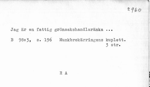 //// Jag är en fattig grönsakshandlaränka ... //// B 98:3, s. 196 Munkbrokärringens kuplett. //// 3 str. //// R A I //// i ¦ //// I ¦ ////