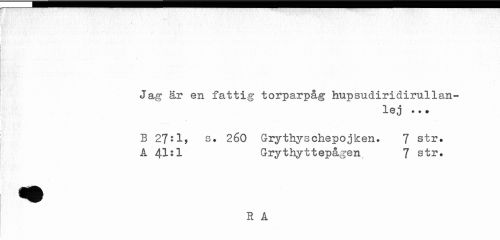 //// 0 //// Jag är en fattig torparpåg hupsudiridirullan- //// lej //// B 2Jti, s. 260 Grythyschepojken. 7 str» A 41:1 Grythyttepågen 7 str. //// R A ////