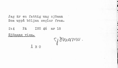 //// i ¦ //// Jag är en fattig ung sjönian Som uppå böljan seglar fram. //// -¦ ¦ //// 2:4 PÅ IHE 46 nr 18 //// S.jömans visa. ; //// ÅBO //// ¦ //// I //// ¦ ////