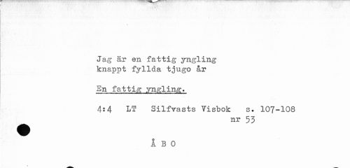 //// \ . . i //// Jag är en fattig yngling knappt fyllda tjugo år //// Bn fattig yngling. //// 4*4 LT Silfvasts Yisbok s. 107-108 //// nr 53 //// a b 0 ////