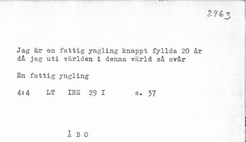 //// m3 //// Jag är en fattig yngling knappt fyllda 20 år då jag uti världen i denna värld så svår //// En fattig yngling //// 4:4 LT IHE 29 I s. 37 //// ÅBO ////
