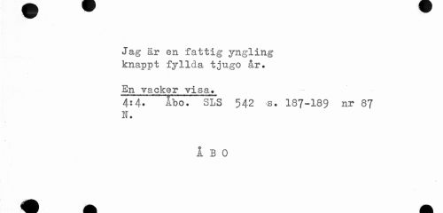 //// Jag är en fattig yngling knappt fyllda tjugo år. //// En vacker visa» //// 4:4» Åbo. SLS 542 "S. 187-189 nr 87 I. //// ÅBO ////