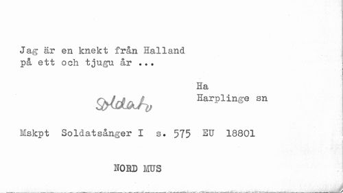 //// Jag är en knekt från Halland på ett och tjugu år ••• //// Ha //// C%/ry ^ JL Harplinge sn //// Mskpt Soldatsånger I s. 575 EF 18801 //// J //// ¦ //// nord mus //// . ^ ; ^ __ ^ ^ ^ __ ^ ^ jjj ////