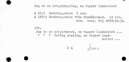 //// Jag är en krigaryngling, en tapper landsoldat A 83:2 B e Tär i ngs visa 8 str. //// A 187:3 Beväringsvisa från Bredåkrahed. 14 str. //// kom. insp. Rtj 8869:30-31. //// Jfr. //// Jag är en krigargosse, en tapper landsoldat ... n " " fattig yngling, en tapper land- //// soldat ... //// R A j^J ////