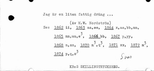 //// ^^ Jag är en liten fattig dräng ... //// (Av M.W. Nordström) 1862 ii, 186g aa,@e, 1864 x,aa,bb,nn, //// 3 //// 1865 nn,uu,e , 1866 bbf 1867 p //// ? //// 1868 n,zz, 18J0 1871 k, 1872 . //// 1874 P,q,o3 ^ //// KB:S SKILLIMGTRYCKSREG. //// __y-s ___f ////