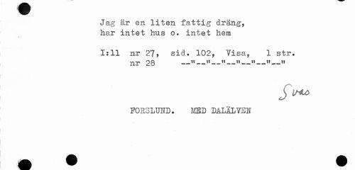 //// Jag är en liten fattig dräng, har intet hus o. intet hem //// 1:11 nr 2?, sid. 102, Visa, 1 str. //// nr 28 __"__11__u__«__«__m__t» //// £ irtA //// F0.RSLUND. MED DALÄL7BH ////