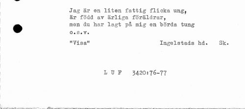 //// Jag är en liten fattig flicka ungf är född av ärliga föräldrar, //// •men du har lagt på mig en börda tung //// o. s. vt //// "Visa" Ingelstads hd. Sk. //// L u F 3420:76-77 ////
