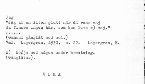 //// j //// ' ¦ //// Jag //// "Jäg är en liten glutt när dä roar mäj //// dä finnes ingen här, som kan luta x) mej." I //// (Gammal gånglåt med mel.) f //// Tml. Lagergren, 4330, s. 22. Lagergren, E. ; //// i //// x) bö/ja med någon under brottning. //// (Gånglåtar). ; //// ¦ //// U L M A | ////