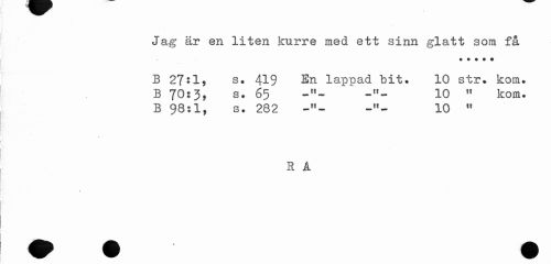 //// Jag är en liten kurre med ett sinn glatt som få //// T //// B 27*1, s. 419 En lappad bit. 10 str. kom. //// B 70:3, s. 65 -»- 10 « kom. //// B 98:1, s. 282 10 « //// R A ////