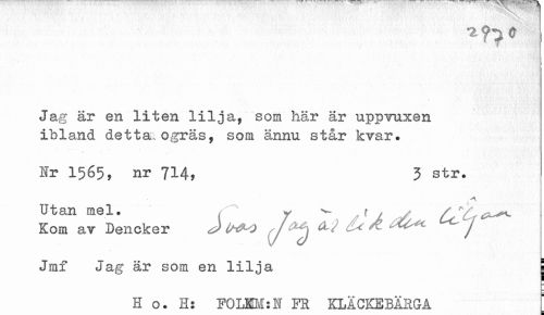 //// Jag är en liten lilja, som här är uppvuxen ibland detta.ogräs, som ännu står kvar. //// Ir 1565, nr 714, 3 str. //// .a //// Utan mel. y ^ t > / /rc ^^^ //// Kom av Dencker J> U&O J SU & ^^ ^ j //// Jmf Jag är som en lilja j //// H o. H: FOLKM:! FR KLACKEBÄSGA //// i ////