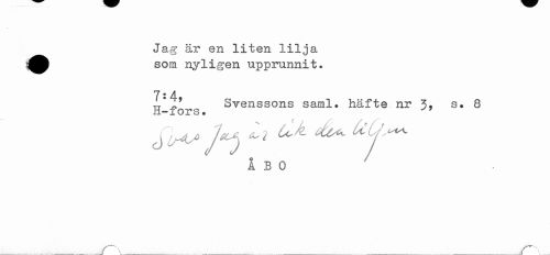 //// Jag är en liten lilja ^^ som nyligen upprunnit. //// 7 • 4 //// h-p Svenssons saml. häfte nr 3, s. 8 //// il- x ors. //// j ^ i l dk etts, UCj,^ //// ÅBO ////