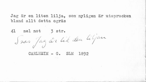 //// Jag är en liten lilja, som nyligen är utsprucken bland allt detta ogräs //// 41 mel not 3 str. //// j ^& ^ //// CARLHEIM -G. SLM 1892 //// "V ////