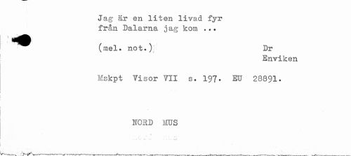 //// Jag är en liten livad fyr från Dalarna jag kom ... //// (mel. not.) Dr //// Enviken //// Mskpt Visor VII s. 197. EU 28891. //// 1T0RD MUS //// -. //// • . . . . ////