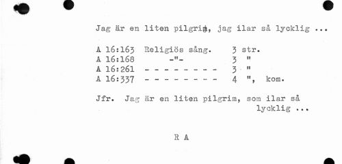 //// Jag är en liten pilgri$, jag ilar så lycklig ... //// A 16:163 Religiös sång. 3 str. //// A 16:168 3 tf //// A 16:261--- - - 3 H //// A 16:337 ---4 % kom. //// Jfr. Jag är en liten pilgrim, som ilar så //// lycklig *•• //// R A ////