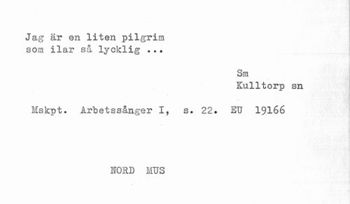 //// Jag är en liten pilgrim som ilar så lycklig ..* //// Sm //// Kulltorp sn Mskpt. Arbetssånger I, s. 22» EU 19166 //// HORD HUS ////