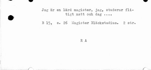 //// Jag är en lärd magister, jag, s fli~ //// ^^ tigt natt och dag //// B 15 //// , s. 26 Magister Bläckstadius. 2 str. //// R A //// ...* . r-, ... ..._... _..._ ...r\ ////