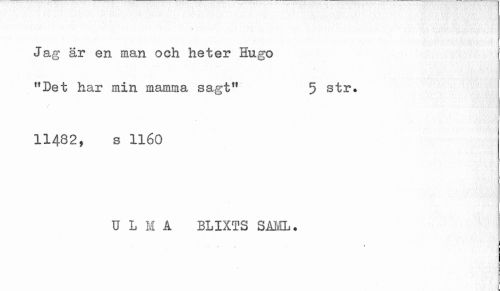 //// Jag är en man och heter Hugo //// "Det har min mamma sagt" 5 str. //// 11482, s 1160 //// U L M A BLIXTS SAML. //// » //// 1 ////