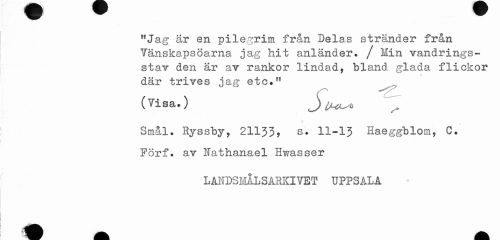 //// "Jag är en pilegria från Delas stränder från Vänskapsöarna jag hit anländer* / Min Tandrings- //// stav den är av rankor lindad, bland glada flickor //// i //// där trives jag etc." //// (Tisa.) J) lui^ ^ //// i. //// Smal. Hyssby, 21133, s. 11-13 Haeggblom, C. //// //// Förf. av Ifathanael Hwasser //// LANDS MÅL S AEKI VE T UPPSALA ////
