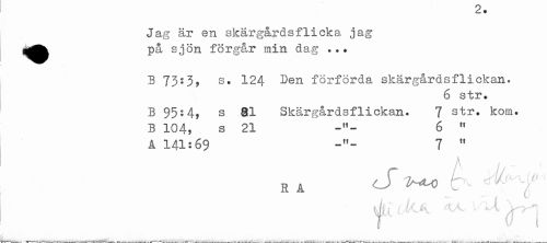 //// W //// Jag är en skärgårdsflicka jag P& sjön förgår min dag ... //// B 73s3, s. 124 Den förförda skärgårdsflickan. //// 6 str. //// B 95:4, s 81 Skärgårdsflickan. 7 str. kom. B 104, s 21 6 " //// a 141:69 7 " //// a , // - //// a a J ^ k c k- //// ¦ jääiA ////
