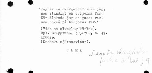 //// "Jag är en skärgårdsflicka jag, som ständigt på böljorna far, Där älskade jag en gosse rar, som också på böljorna far*" //// (Tisa om olycklig kärlek). //// Upl. Skepptuna, 303:702, s. 47-Kruuse. //// (Enstaka sjömansvisor). //// U L M A //// J> i^uo érV r/u^tP'0 - //// t - i - O . a ^ //// / /.• - ¦ ? 'i ' VSS, ö A //// 4 I :: \ ; \ /ik 1 I //// t " y ^ l ////