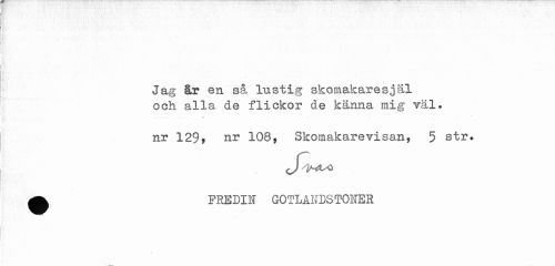 //// / //// Jag år en så lustig skomakaresjäl och alla de flickor de känna mig Täl. //// _ 1 ... V - //// nr 129, 108, Skomakarevisan, 5 str. //// ^ FREDIN GOTLANDSTONER //// / ////
