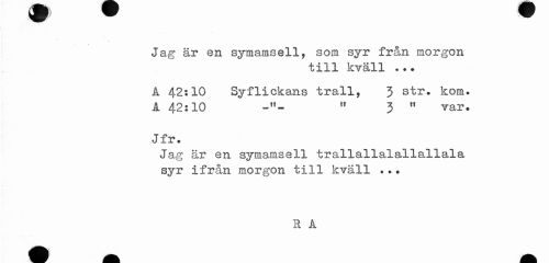//// Jag är en symamsell, som syr från morgon //// till kväll ... //// A 42:10 Syflickans trall, 3 str. kom. A 42:10 tf 3 w var. //// Jfr. //// Jag är en symamsell trallallalallallala syr ifrån morgon till kväll ... //// R A ////