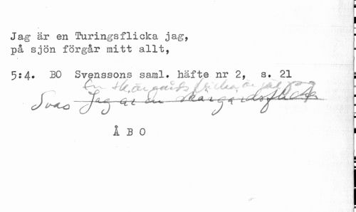 //// I //// Jag är en Turingsflicka jag, //// på sjön förgår mitt allt, ¦ //// 5*4* BO Svenssons saml» häfte nr 2, s» 21 I //// ¦ //// ÅBO i //// } ////