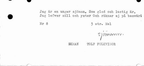 //// Jag är en unger sjöman, Som glad och lustig är, ^^ Jag lefrer säll och yster Och räknar ej på besvär! //// Nr 8 3 str» Mel //// ? ^ //// <>I #f¥vrv» //// BKMAI TOLP FOLKVISOR //// ___\..._...___..._...t___ ////