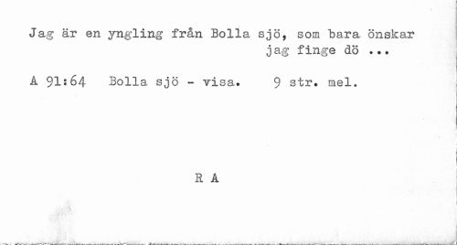 //// Jag är en yngling från, Bolla sjö, som bara önskar //// jag finge dö ... //// A $1:64 Bolla, sjö - visa. 9 str. mel. //// i //// 3x A ¦ //// 1 //// A ////
