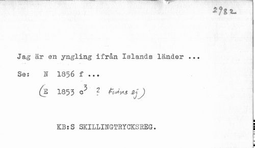 //// Jag är en yngling ifrån Islands länder ... //// Se: N 1856 f ... //// V.-' //// (E I855 t fry.**, sjj //// KB:S SKILLIHGTRYCKSREG. | ////